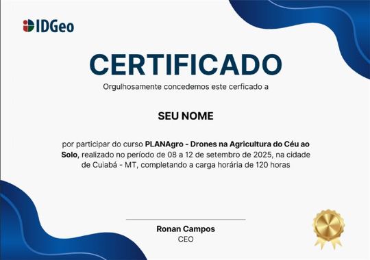 em Sistemas de Informação Geográfica (GIS).Pela primeira vez no Mato Grosso, o PLANAgro chega com foco especial no uso de drones na agricultura, combinando teoria e prática para formar profissionais capazes de dominar desde o planejamento de voo até a análise de dados e geração de mapas temáticos.